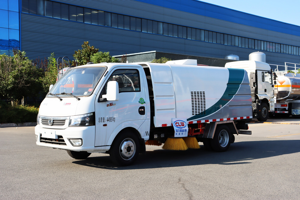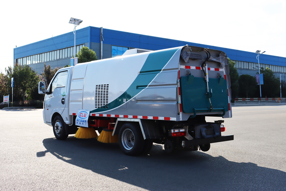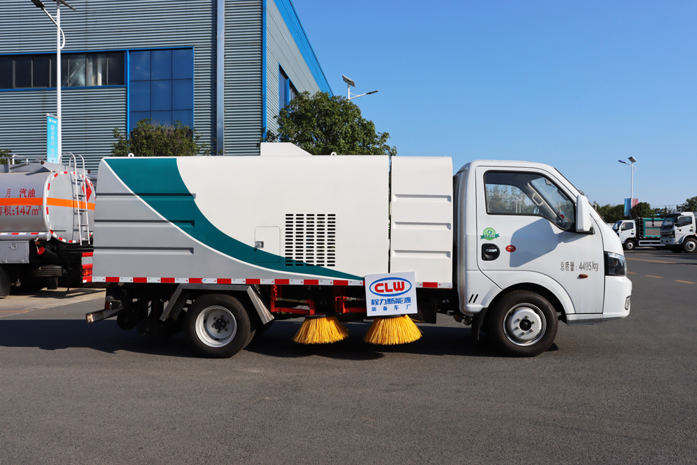 3、掃路車采用東風(fēng)純電動(dòng)二類汽車底盤改裝,加裝風(fēng)機(jī)、清水箱、垃圾箱、左右立掃、帶噴水桿的寬吸嘴、掃盤降塵系統(tǒng)、液壓系統(tǒng)、專用裝置電控系統(tǒng)和副車架等改裝而成。