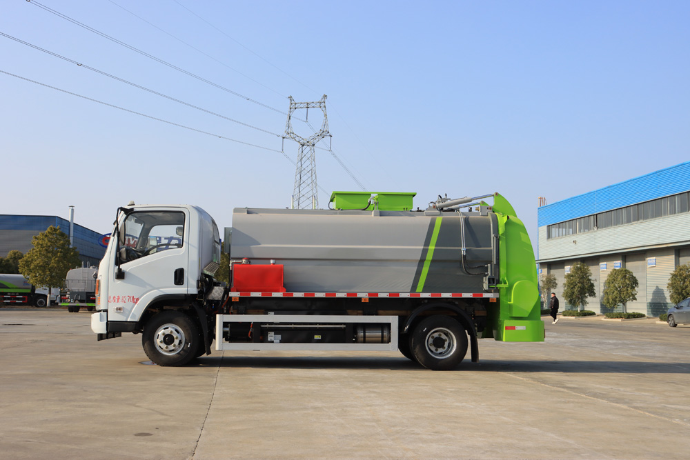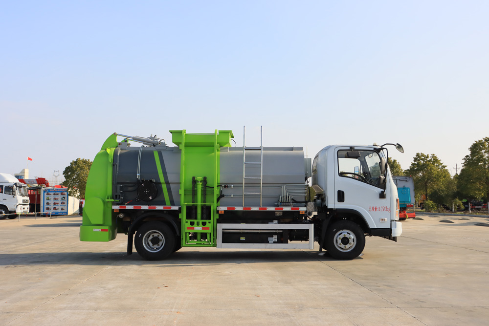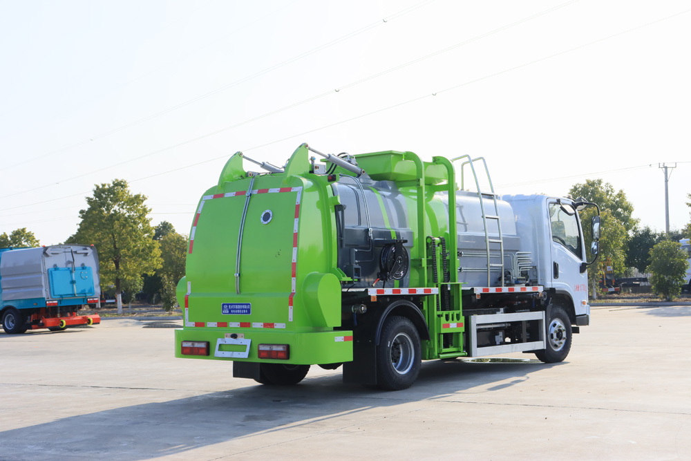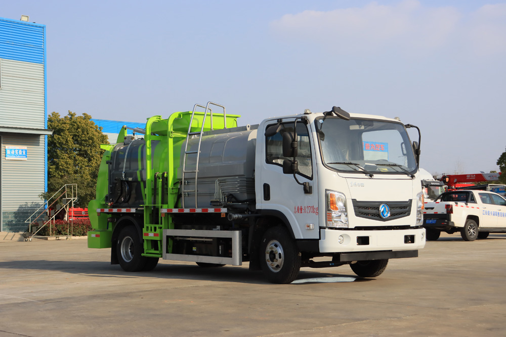 四、其他說明: 東風純電動餐廚垃圾車是在東風純電動二類底盤的基礎上,加裝垃圾箱、垃圾桶提升機、清洗裝置、液 壓系統(tǒng),由機械、液壓(氣路)、電器三部分合為一體的專用廚余垃圾處理、轉運作業(yè)車。 工作原理:整車為全密封型,自行壓縮、自行傾倒、壓縮過程中的污水全部進入污水箱,徹底的解決了 垃圾運輸過程中的二次污染,具有壓力大、密封性好、操作方便。安全等優(yōu)點。垃圾箱可實現箱內餐廚垃圾 固液的初步分離,并采用大容積污水箱,提高產品裝載量; 電控系統(tǒng)采用無線遙控,并通過作業(yè)動作邏輯互 鎖,保證操作的精準性,杜絕誤操作。