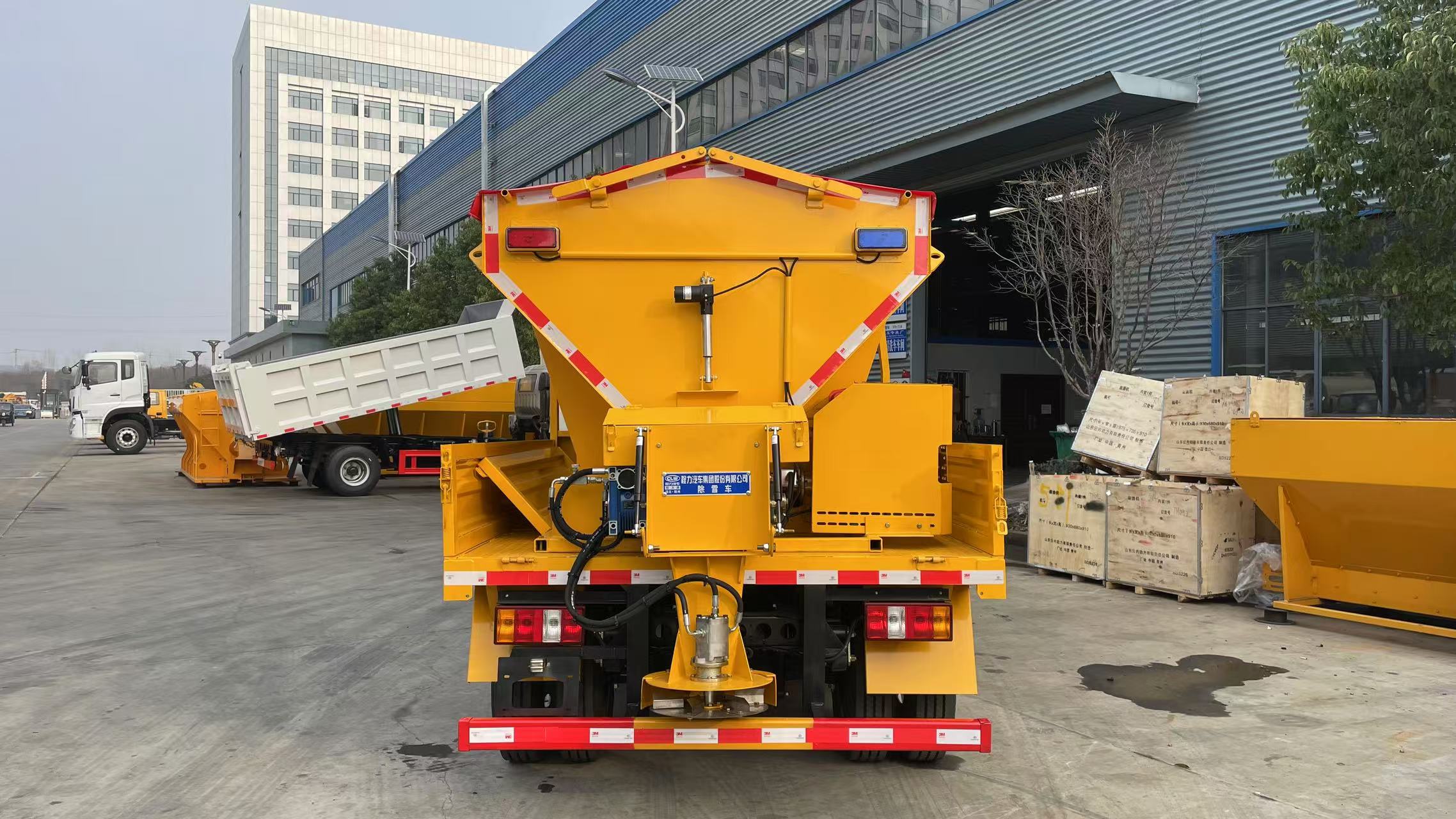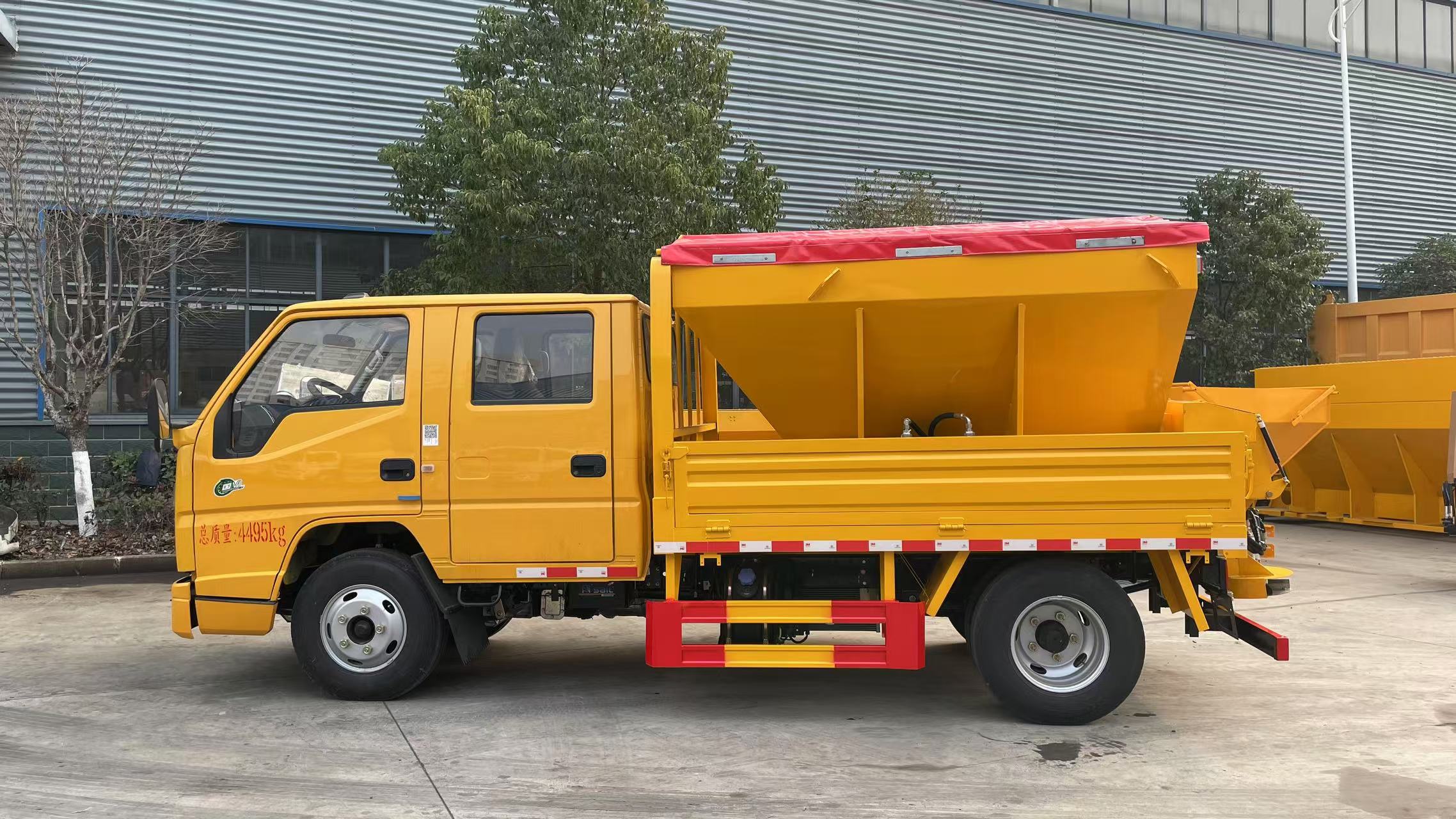 該車特點 該車用于冬季撒布融雪劑,專用裝置為撒布機; 僅選用3360mm軸距底盤; 側后防護材料:Q235,連接方式:左右側及后下部防護均采用焊接連接, 后防護截面尺寸(mm):100×50,下邊緣離地高410mm;