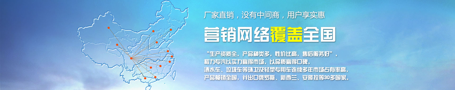 我公司致力于開發生產銷售專用汽車為已任,為您量身打造方便實用,耐用的專用汽車,其主導品種有園林綠化灑水車、環衛灑水車、油罐加運油車、吸糞車、吸污車、擺臂、掛桶、密封式垃圾車、廂式運輸車、消防車、半掛車、自卸車、水泥車、隨車吊等八大系列100多個品種300多個車型。同時批發東風、解放、福田等各種二類底盤。目前我公司銷售網絡基本已覆蓋全國各地,具體如下。