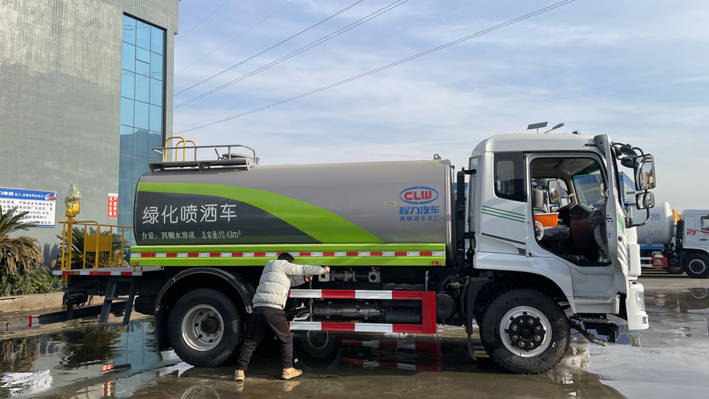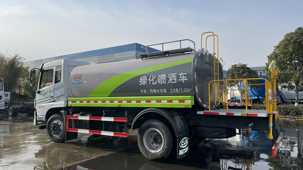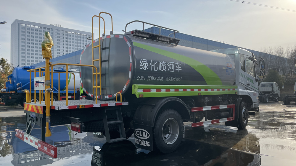 該車僅采用3950mm軸距,主要用于灑水及園林綠化。主要專用裝置由罐體、噴灑系統組成。罐體總容量:10.43立方米,有效容積:9.95立方米,介質:丙酮水溶液.密度:950千克/立方米,罐體尺寸(長×寬×高)為(mm):4200×2350×1500;